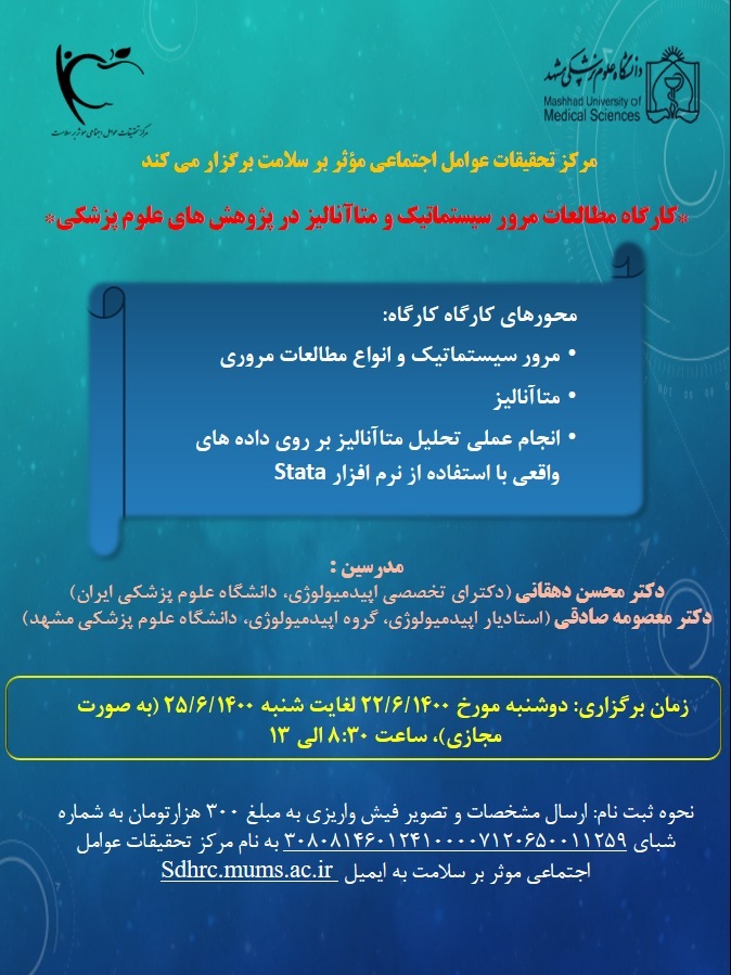 Committee بدون مجموعه 01 September 2021 Hits: 2199 Rating: ( 0 Rating ) كارگاه مطالعات مرور سیستماتیک و متاآنالیز در پژوهش های علوم پزشکی User Rating: 0 / 5 Please Rate Vote 1 Vote 2 Vote 3 Vote 4 Vote 5 Prev Next